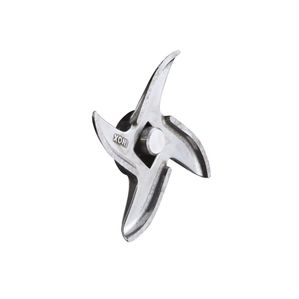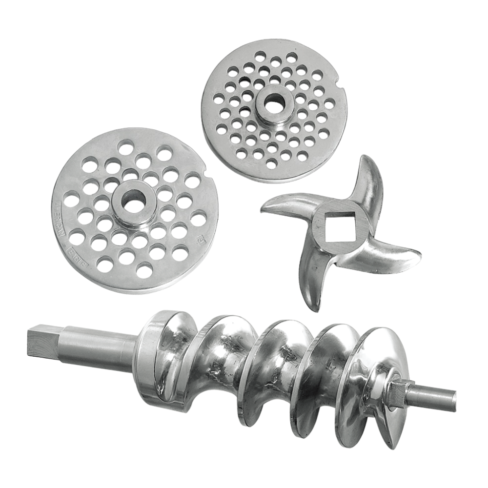 Fit in the screw feeder, knife (blades facing out), and grinding plate.