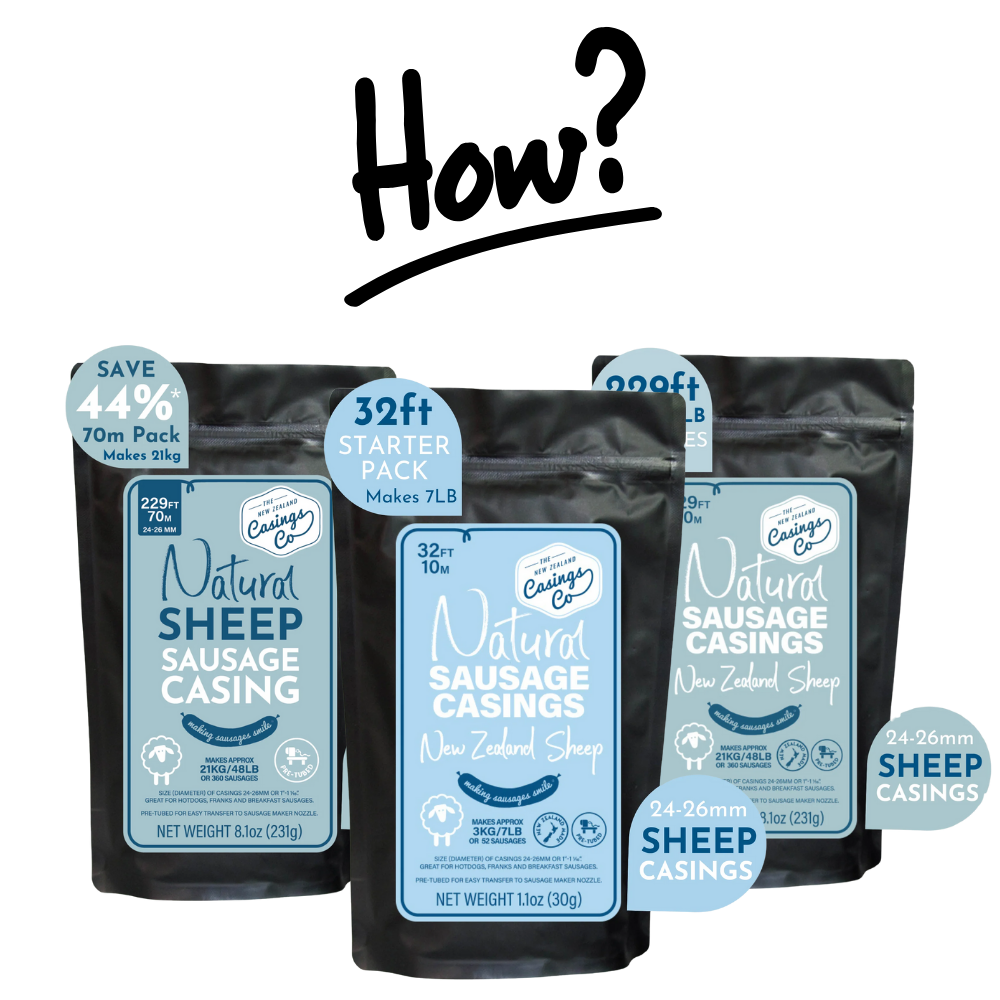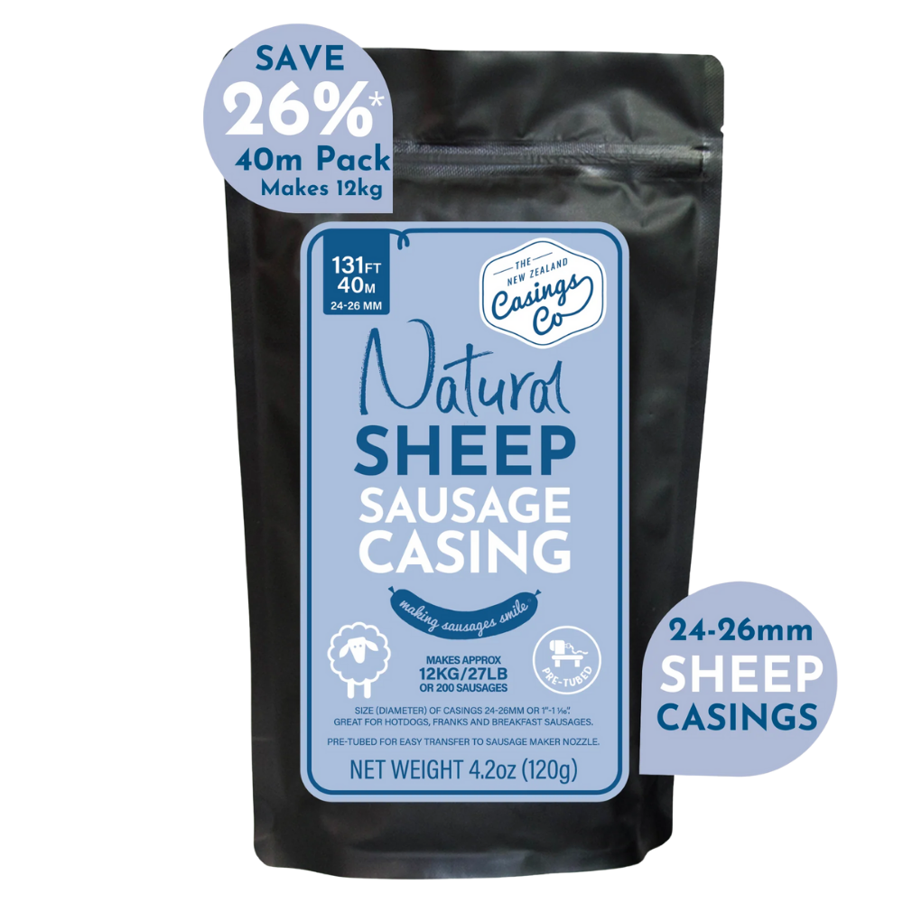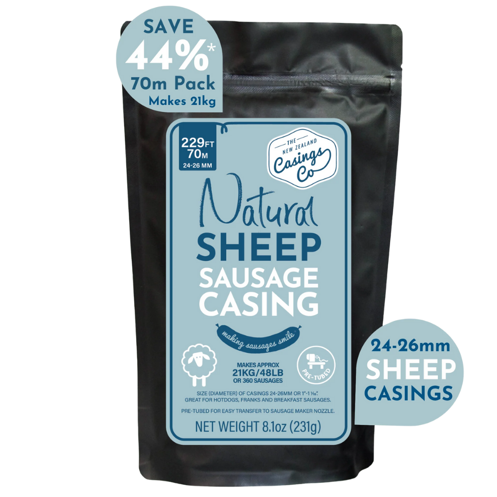 Natural sheep casings are what give sausages their traditional bite. At 24-26mm, these casings are ideal for slimmer sausages that stay juicy, cook evenly, and deliver that unmistakable natural snap when you bite in. They’re prepared, graded, and pre-tubed to make stuffing straightforward at home, whether you’re doing a small weekend batch or a longer run for the freezer. Built for makers who care about texture, flavour, and doing things properly.
